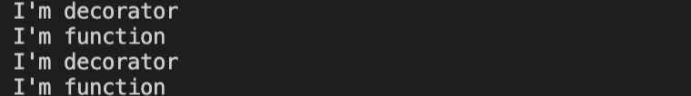 이 코드의 실행 결과는 아래과 같다. 위 코드를 통해 데코레이터의 동작 방식에 대해 알 수 있는데 먼저 데코레이터는 @deco와 같이 '@'를 이용해 함수 바로위에 작성되며 해당 함수를 입력으로 받아 어떤 처리 후 함수를 다시 반환하는 역할을 한다.