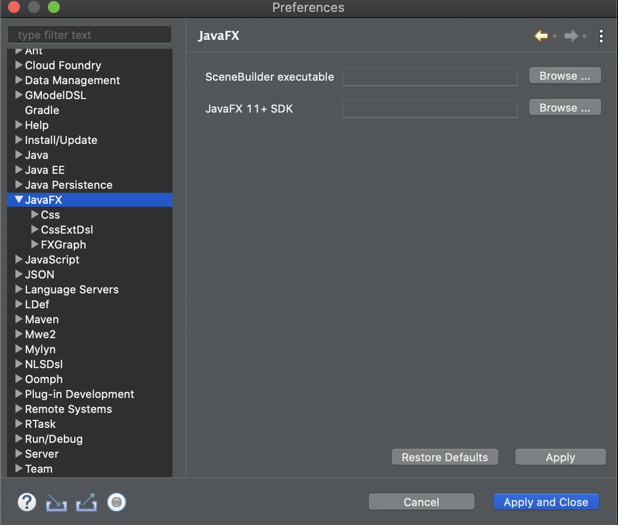 Eclipse Tab 창에서 Eclipse-> Preferences (윈도우의 경우 Window -> Preferences) 로 들어가 JavaFX 항목을 선택해 Scenebuilder의 디렉토리를 추가해야한다. 이는 이후에 JavaFX 프로젝트에서 Scenebuilder를 이용하기 위함이다.
