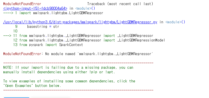 colab에서 pyspark를 돌리다가 lightgbm을 사용하려고 mmlspark를 install하고 아래와 같은 코드를 돌릴려고 하니 발생한 오류