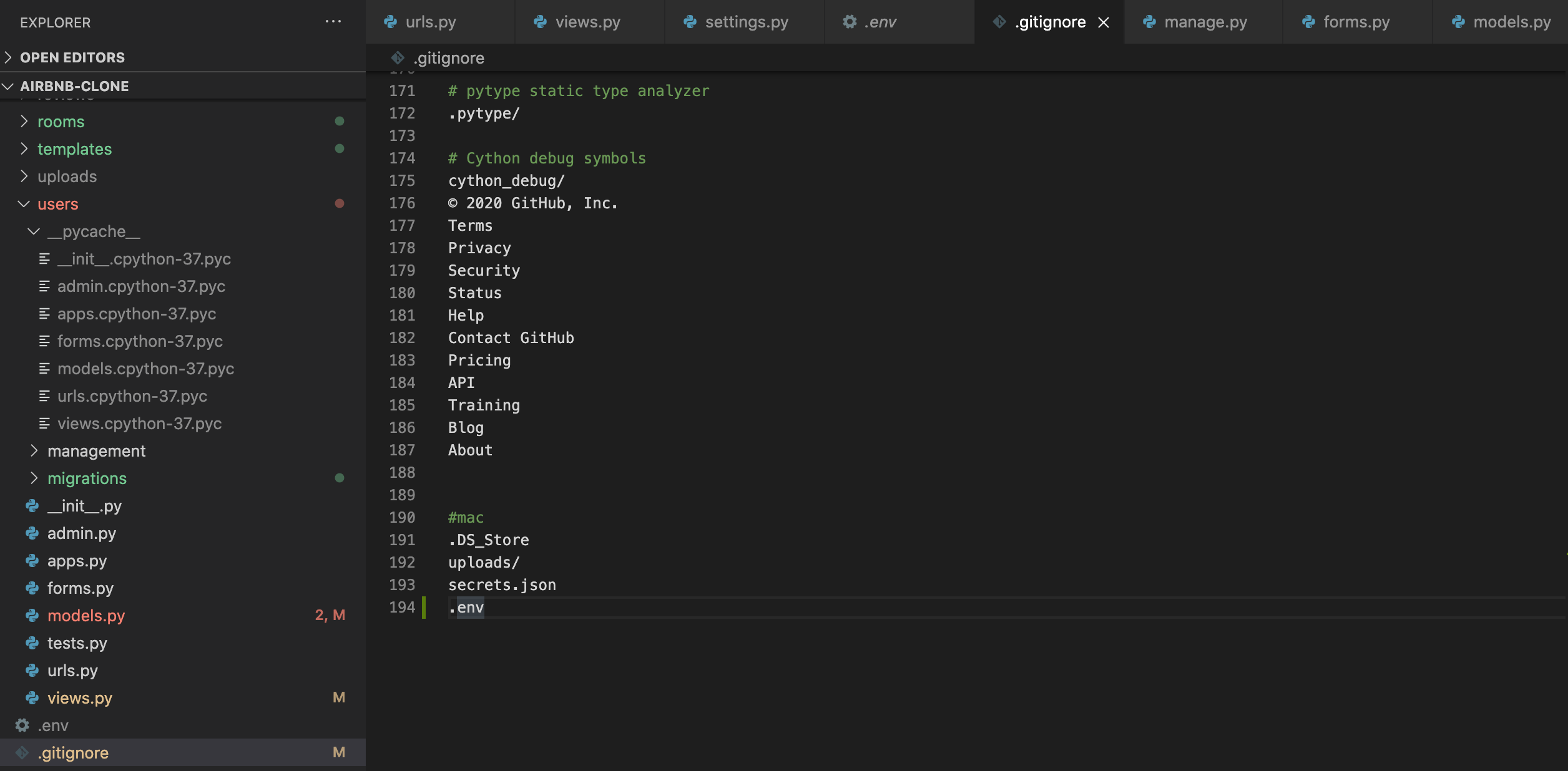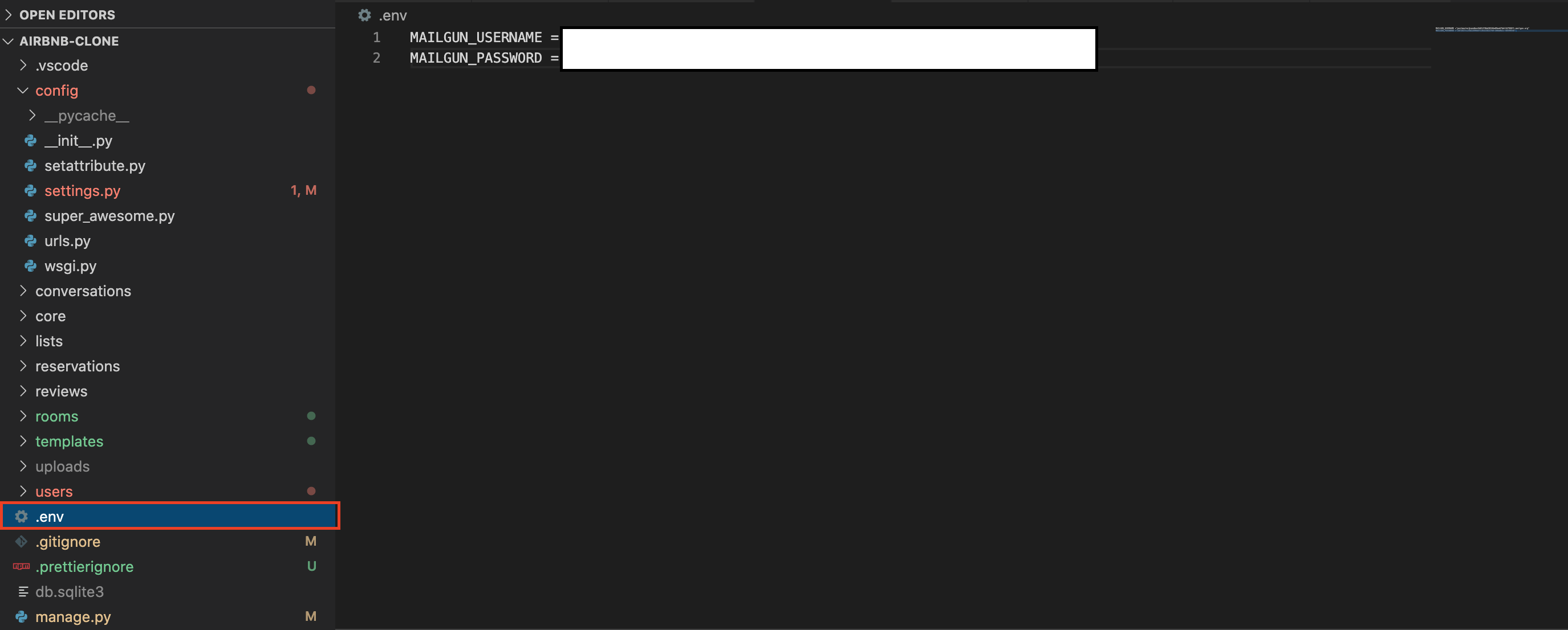 manage.py가 있는 디렉토리에 .env 파일을 만들어 준다. 그리고 .gitignore에 .env를 추가해준다.,