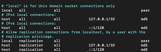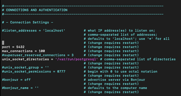 여기서 listen_addresses를 변경해주면 된다. 만약 모든 ip 주소에대해 허용하고 싶으면 listen_addresses = '0.0.0.0' 으로 해주면 된다.
